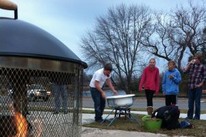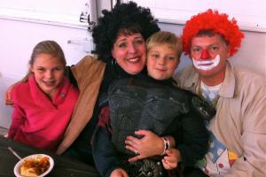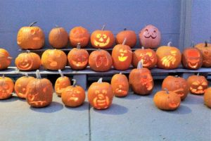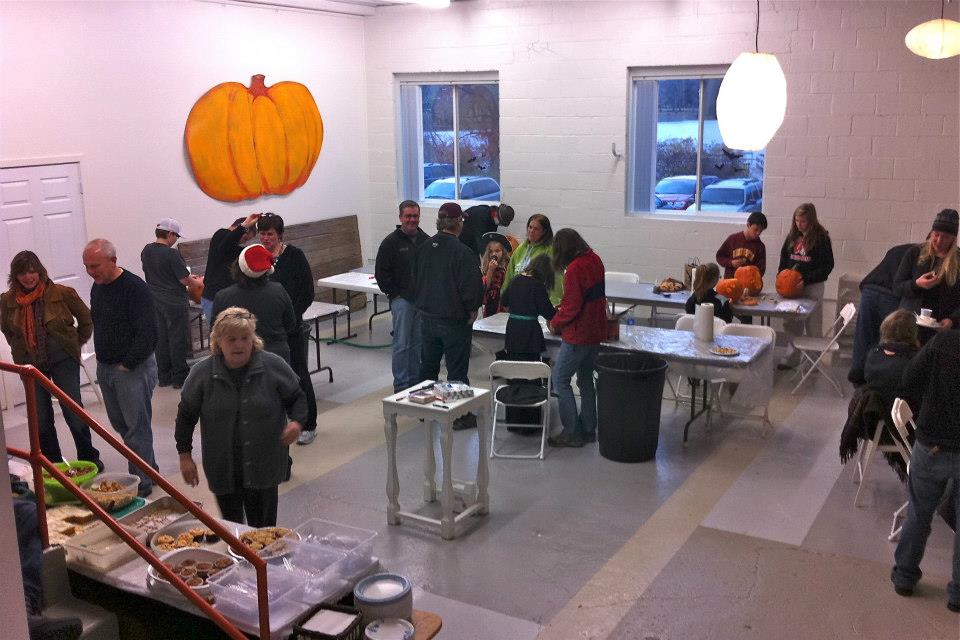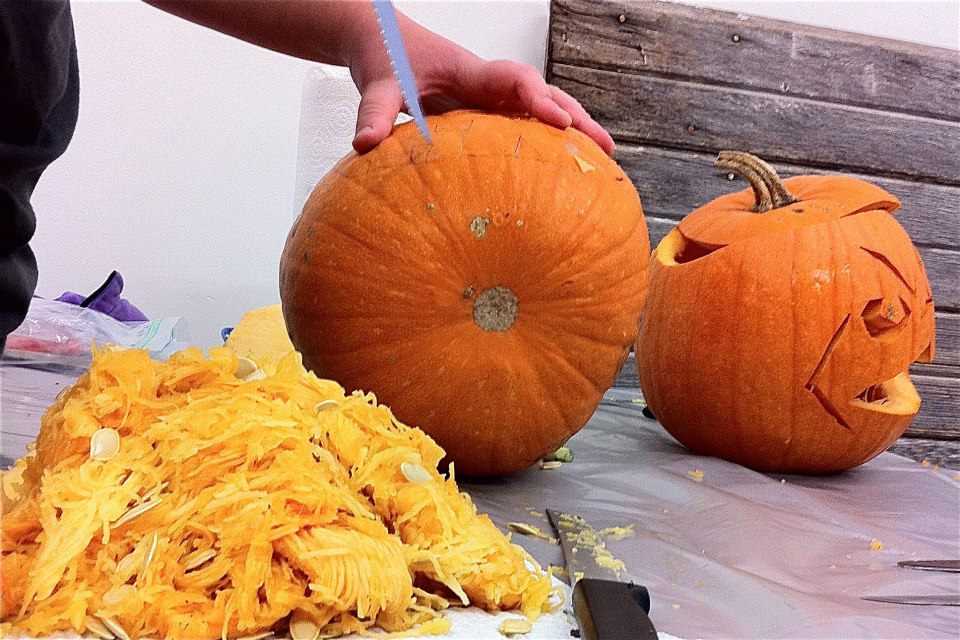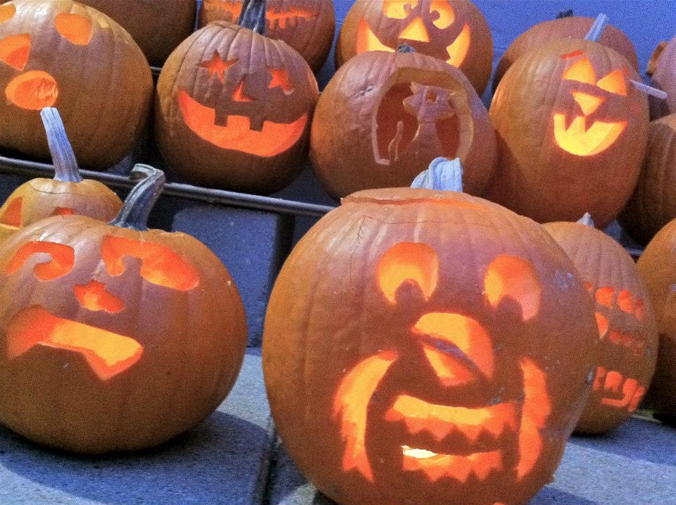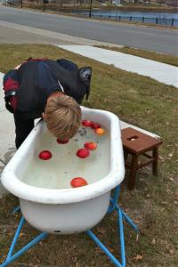 We had our first Carvation party, and it was so very fun. Folks came, costumed, carved, conversed and consumed a delicious potluck array. From all reports–at all age levels–it was deemed a success. Families got to scoop and carve together in the warmth of the garage, and we made it through with only one small injury (an adult who shall remain nameless!) The older kids loved the apple-bobbing and had no fear of ruining costumes or hairstyles. Their enthusiasm led them straight into the freezing water for the elusive floating fruits. The activity on the corner and our impromptu lighting & award ceremony seemed to slow traffic, and the random passersby got to enjoy our large display of jack-o-lanterns after the projects were complete. Good times, good times!
