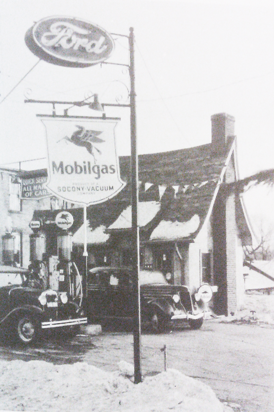 The portion of the building we refer to as ‘the chalet’ was built in the 1930s as a satellite sales office for Strong Motors, a Ford dealer out of Atwater, MN. They sold Model As and Ts, I am told. Sometime later (dates are mushy around here), the building changed hands and was converted to a Mobilgas station–classic pumps are shown in the picture above. At this time, the road still ran across the front of the building. Boy, what I wouldn’t give today to have some of that gorgeous signage shown in the old photos!